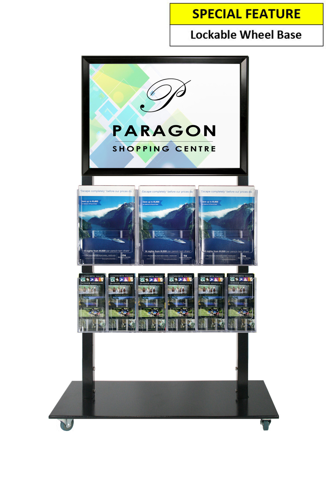 The Mall Stand is a portable display stand. This is a Single Sided black freestanding stand with a A2 Poster Display with 3 A4 and 6 DL Brochure Holders. It is sturdy and made of Steel and powder Coated in Black. It is 143cm high which enables you to easily look over it to see beyond the line of sight. The frame is a tamper proof snap frame with a steel backing. The frame remains locked unless bottom, sides then top profiles are opened sequentially. The Acrylic Brochure holders are scratch resistant and have a glass like appearance. The base is a low profile lockable wheel base that has removable wheels. They are ideal for venues and shopping malls to advertise or promote events. They can be used in a variety of indoor or under cover locations for a smart, professional look for your businesses signage and promotions.